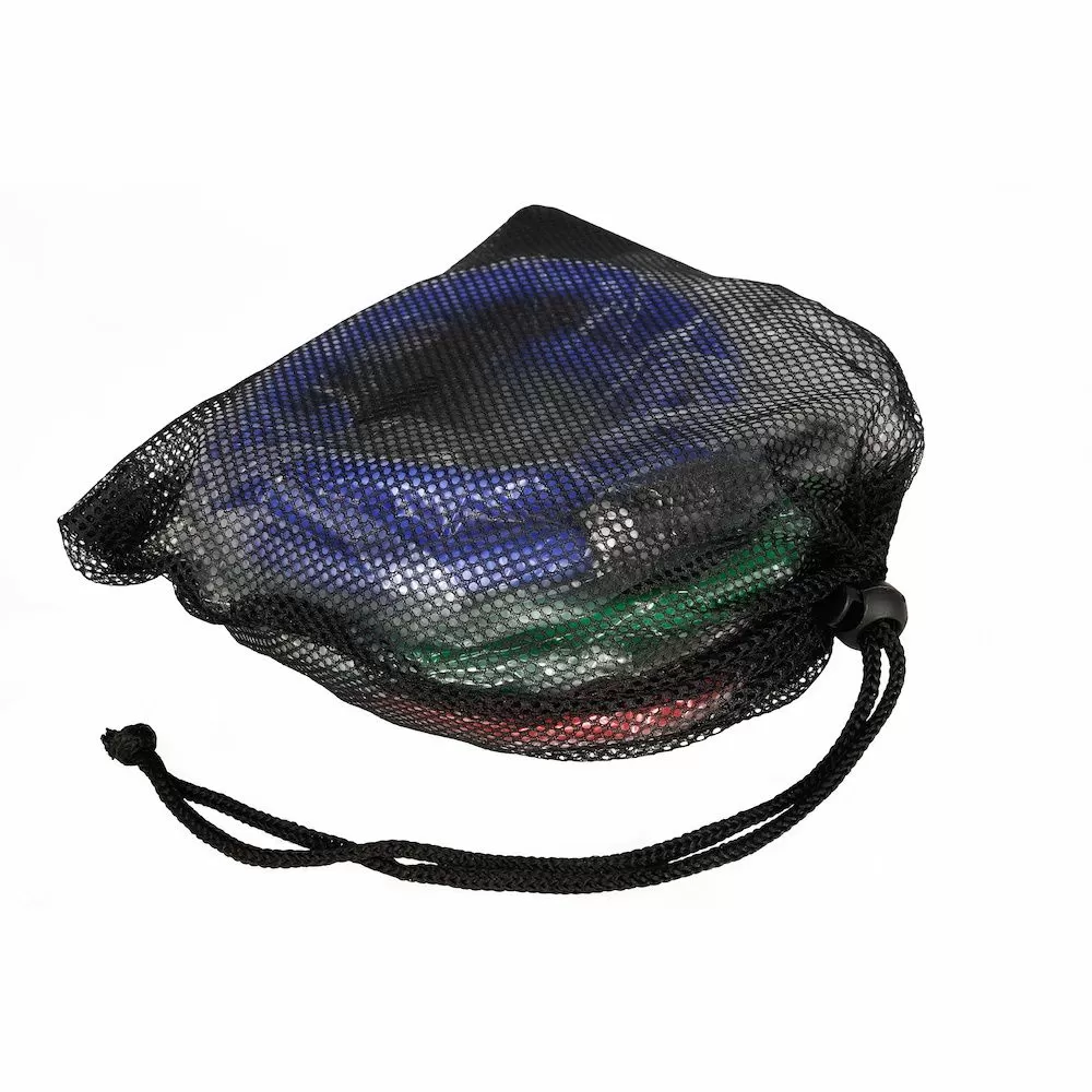 · set sadrži 3 gume različite rastezljivosti (jačine), 2 ručke (rukohvata ) koji se lako kače na odgovarajuću gumu, i platnenu kesu za prenošenje